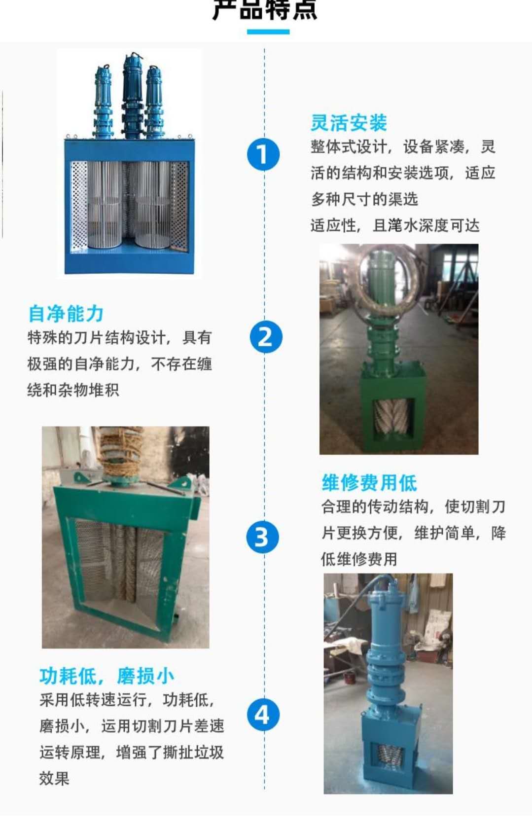 該設備應用先進技術將污水,污物中的中大體積固體顆粒粉碎成6—10mm的細小顆粒,與污水一起進入后續處理工序,無需進行格柵渣滓的清運,為實行泵站地埋式的全封閉設計創造了有利條件,節約了土建造價,美化了環境,廣泛應用于市政、水利泵站系統;可代替傳統格柵或與其配合使用。與傳統格柵的泵站相比,柵渣在水中進行粉碎處理,無需清理廢棄物;可避免臭氣外泄,保護環境,大量減少占地面積;安裝維護簡單,可實現水下自動耦合安裝。