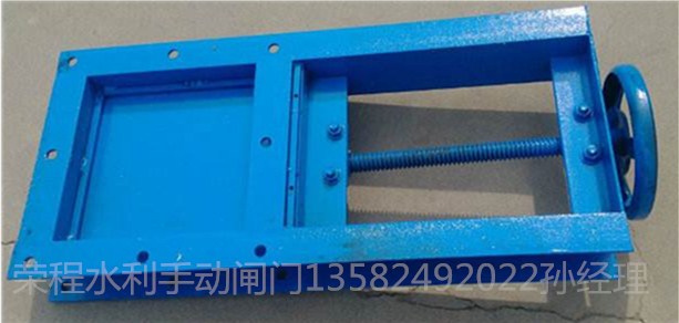 手動閘門主要由框架、閘板、絲桿、螺母等零件構成,用手轉動手輪使絲桿帶著絲桿螺母和閘板沿水平方向往復運動,達到閘門的啟閉目的。